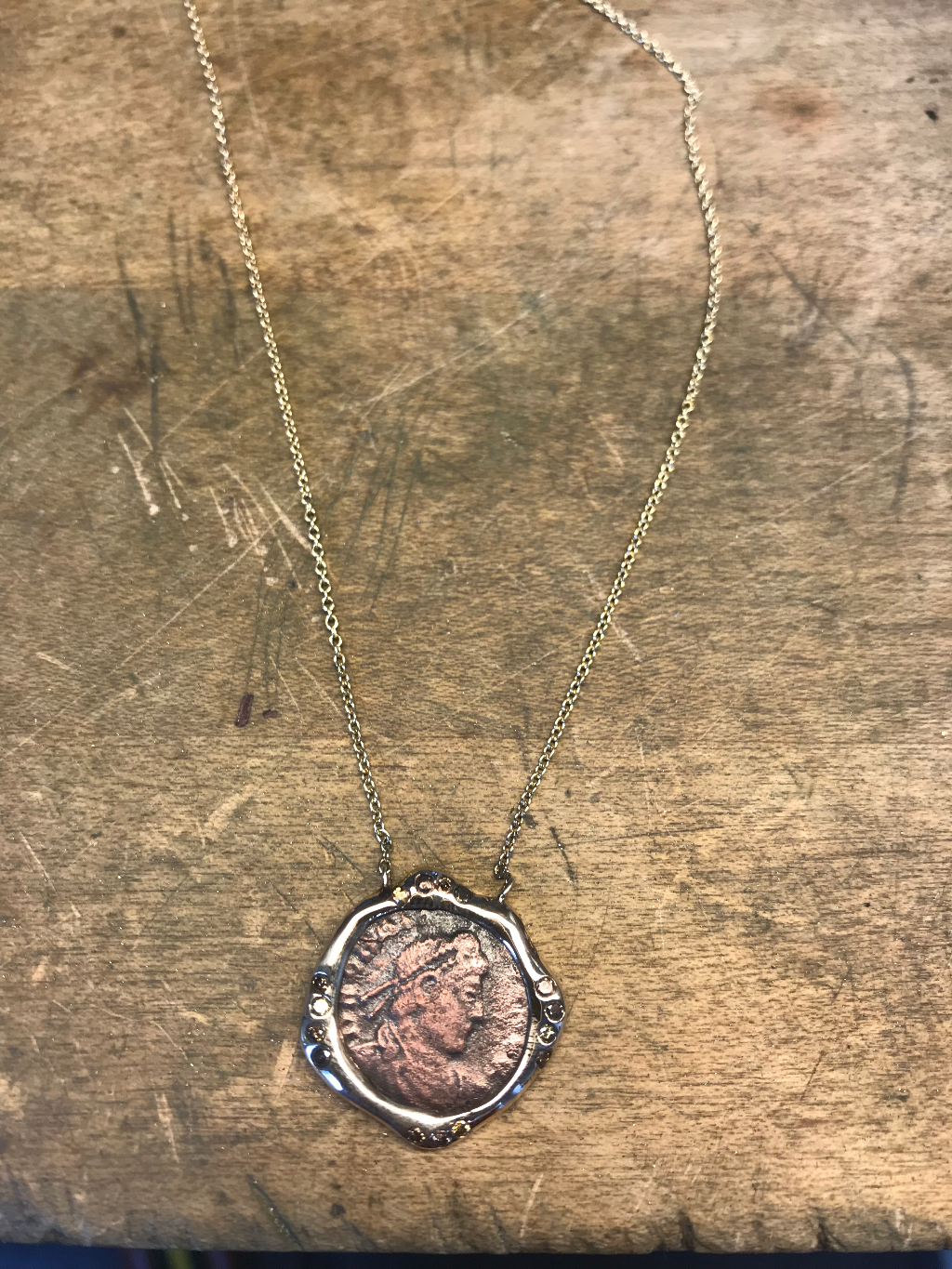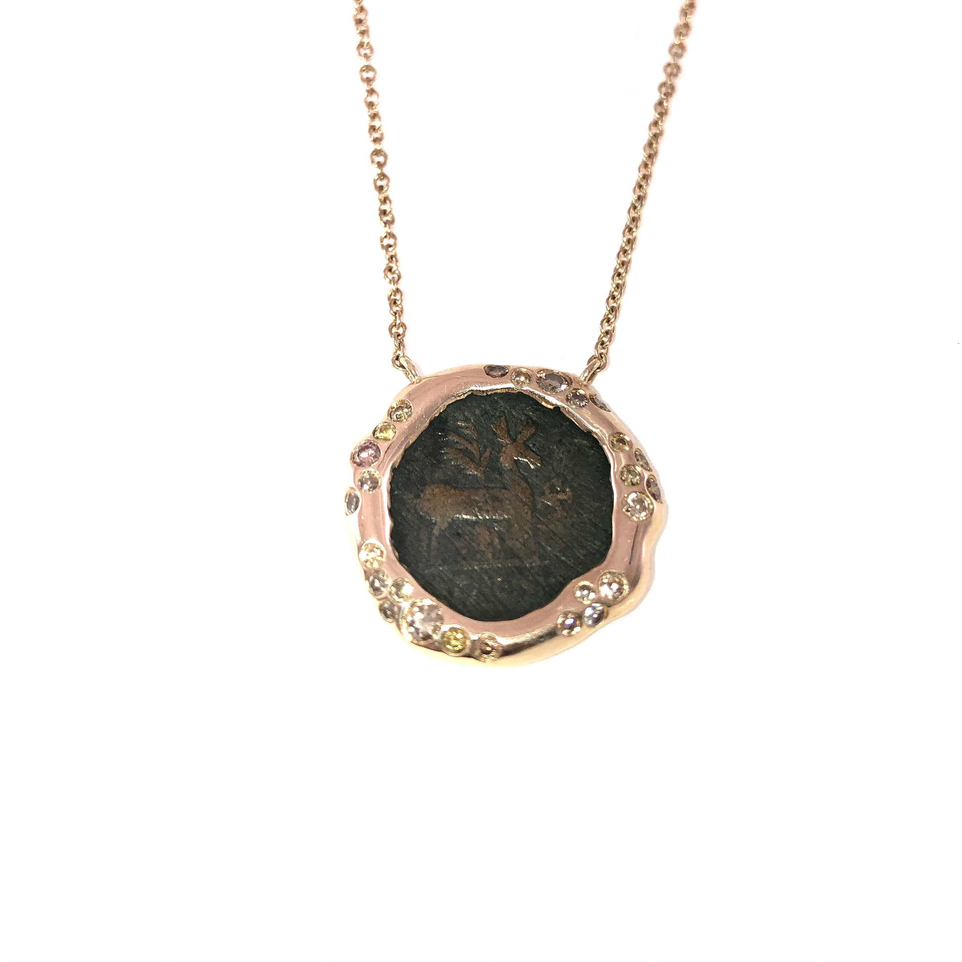 A historic Greek Drahim Rose coin is framed in 14K gold and crowned with vivid pink sapphires. A wearable artifact ancient and deeply personal, radiant and evocative. Includes an 18 gold chain. Earlier custom-made coins (Roman, Greek, Jewish) shown here can be remade upon request.