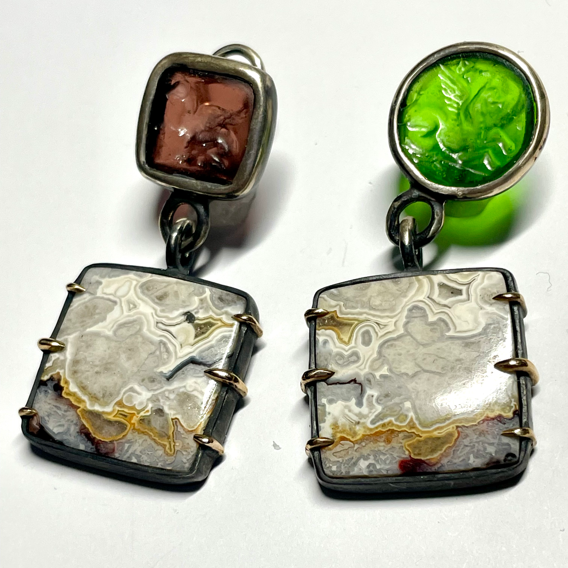 Elegant silver earrings featuring lace agate and antique-style glass intaglios accented with gold details.