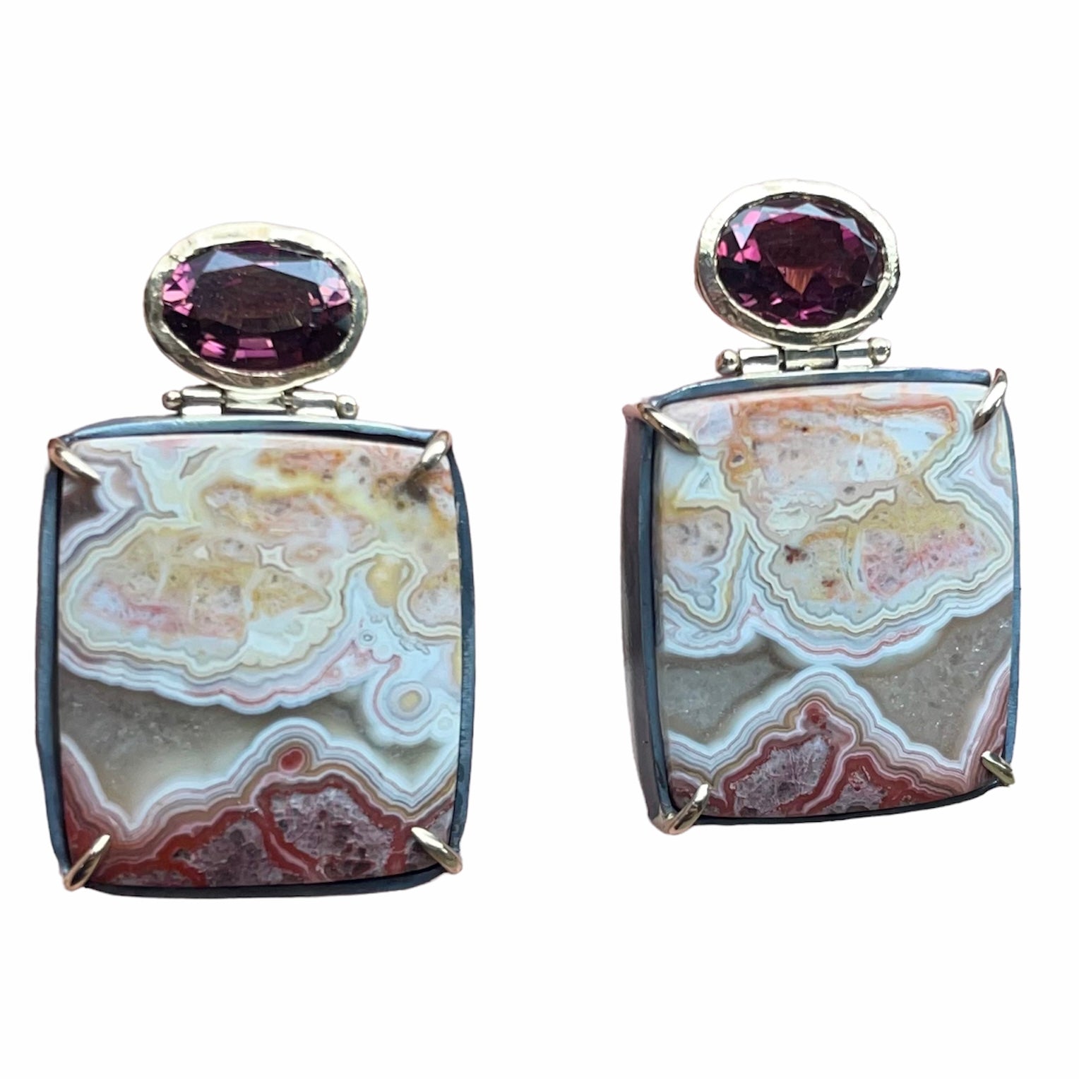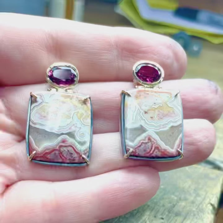 Handcrafted silver earrings featuring lace agate and tourmaline. A vibrant and artistic combination of gemstones set in sterling silver.
